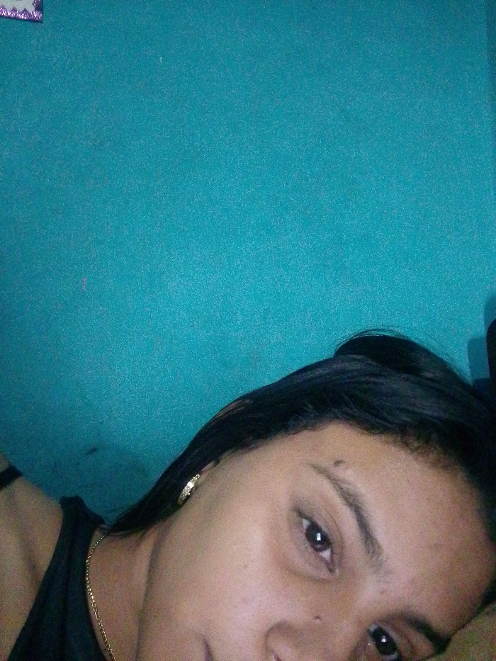 A woman with dark hair and an earring is the focus, positioned in the lower right of the frame. She is wearing a black tank top and a gold necklace. Her eyes are open, and she is looking towards the camera. The background is a teal wall, mostly out of focus. Part of her body is visible on the left side of the frame.