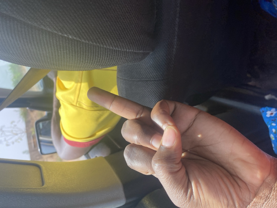 The image captures an interior view from a vehicle in Unguwar Gaya, Nigeria, under bright daylight conditions. In the foreground, a dark-skinned left hand is visible, positioned with its palm facing upward and slightly towards the viewer, with the middle finger extended in a pronounced gesture. A small, bright point of light, consistent with a sun reflection, is evident on the palm. To the right, a black fabric car seat headrest occupies a significant portion of the frame. Beyond the hand and headrest, the upper body of an individual wearing a bright yellow short-sleeved shirt with red trim is partially visible, seated in a forward position. Through the vehicle's open window and side mirror, a hazy outdoor environment is discernible, featuring distant green vegetation and a light-colored, possibly dirt or sand, landscape under a bright sky. A small section of blue fabric patterned with white and red flowers is visible at the bottom left edge of the frame.