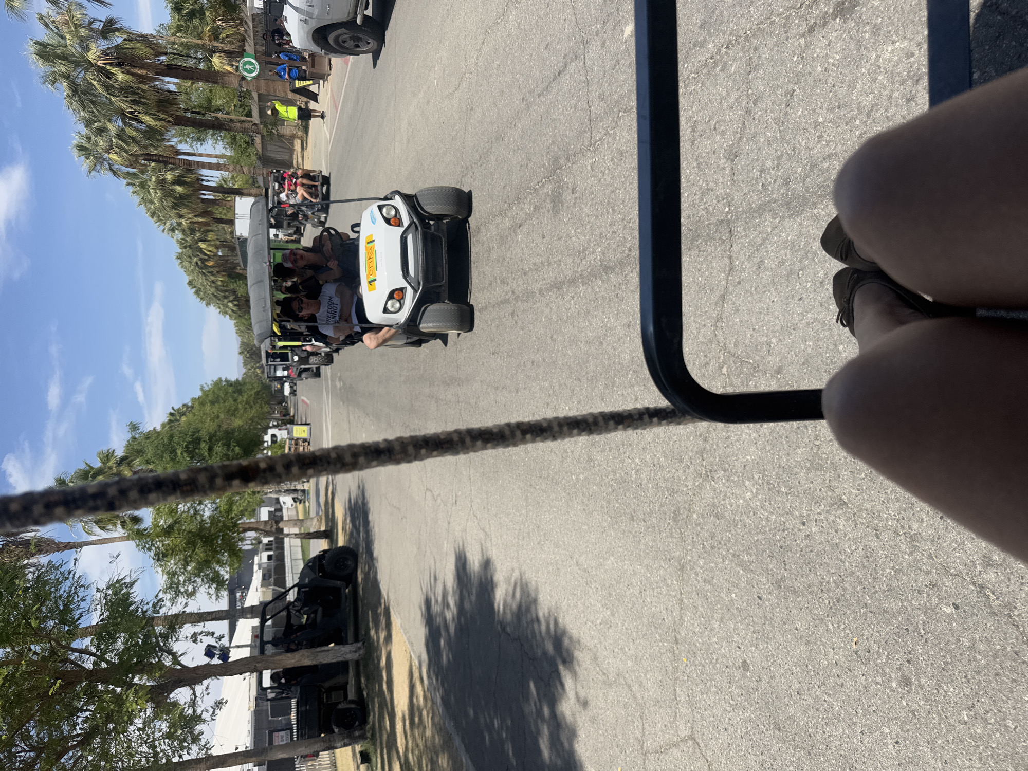 row of golf carts driving on a paved road in Indio, California. Palm trees line the side of the road. The photo is taken from inside a golf cart, with a rope and part of the cart's frame visible in the foreground. A person's legs and feet are also visible inside the golf cart. Other golf carts with passengers are visible ahead on the road.