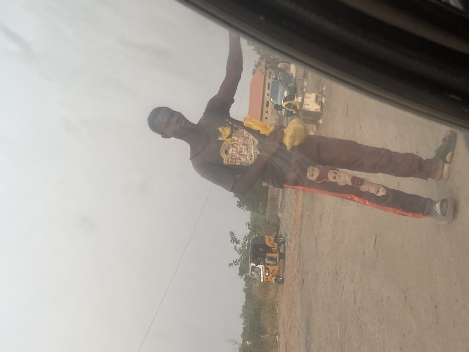 The image captures a roadside scene in Adonkolo, Nigeria, from the perspective of a vehicle's interior
