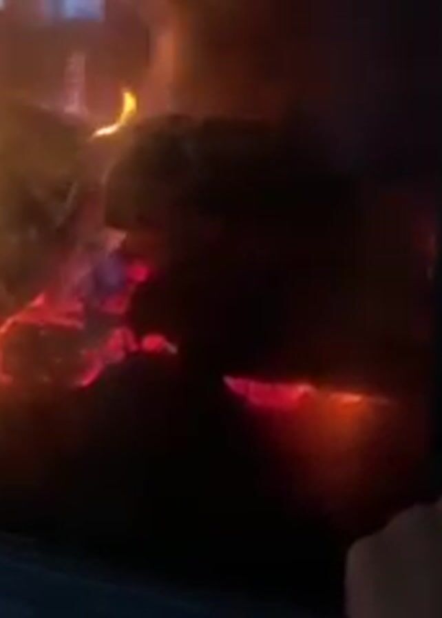 close-up of a fireplace. A hand opens the door to reveal burning logs and bright flames. The interior of the fireplace is brick. The logs are arranged in a pile, with some of them glowing red hot. There is a bed of ashes at the bottom.