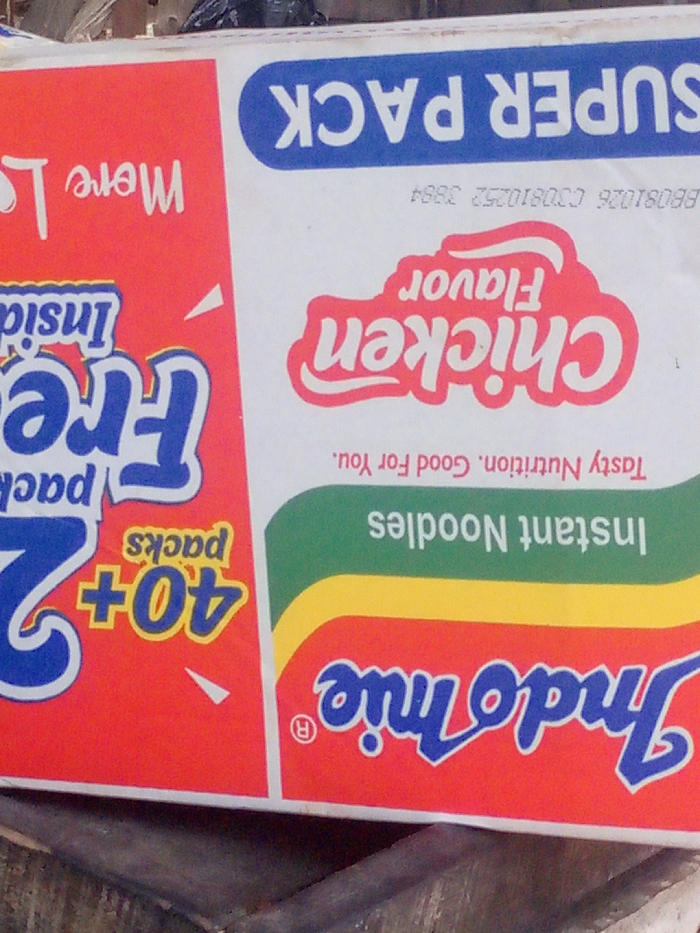 - "The image displays a close-up, top-down view of a large retail carton of Indomie Instant Noodles, Chicken Flavor, with the carton oriented upside down, causing all text to appear inverted" by FM-UnvUQ2, licensed under CC BY 4.0