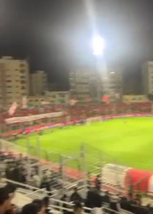 view from a stadium seat during what appears to be a soccer game. A green field is illuminated by bright stadium lights. Players in red and white uniforms are visible on the field. Spectators fill the stands, many wearing red and waving red flags. Tall buildings surround the stadium. The video seems to be taken at night.