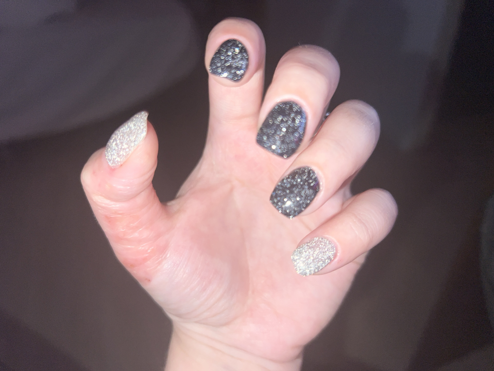 A photograph depicts a human hand against a blurred background of dark and light browns. The fingernails of the thumb and pinky are covered in light silver glitter polish. The nails of the index, middle, and ring fingers are covered in dark gray glitter polish. The skin of the hand is fair with areas of redness near the base of the thumb. No location information is provided.