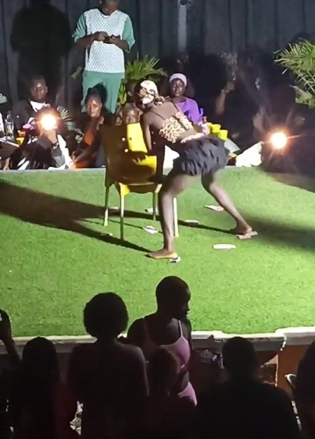 A woman in a leopard-print top and a black miniskirt dances around a yellow chair on an Astroturf stage. She is barefoot and wears a headband. Several people are watching and recording her with their phones. Some are seated at tables on the stage, while others stand in front of the stage. The environment is dimly lit and has a black fence in the background, as well as a few potted plants. One man is standing in the background wearing a green outfit. There appears to be a DJ playing music in the background, though they're not visible.