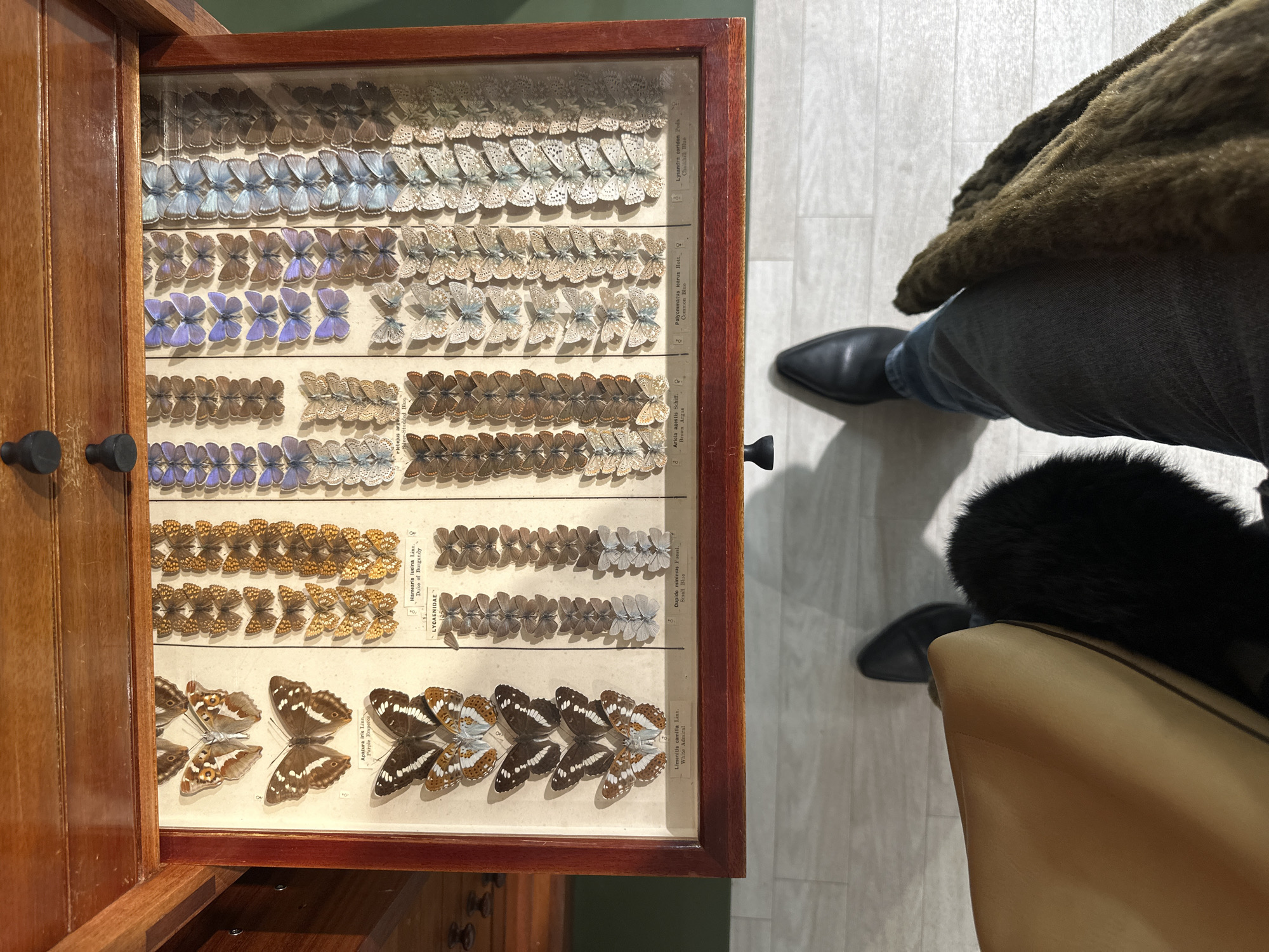 An overhead photograph captures an open wooden museum display drawer containing a collection of pinned butterfly and moth specimens. The scene is located in Tunbridge Wells, United Kingdom. The drawer, constructed of polished medium-brown wood, features a glass top and two dark, round pull handles on its upper frame. Inside, numerous insect specimens are meticulously arranged in vertical rows, accompanied by printed identification labels. Visible species include "Apatura iris Linn. Purple Emperor," "Hamearis lucina Linn. Duke of Burgundy," "Limenitis camilla Linn. White Admiral," "Cupido minimus Fuesal. Small Blue," "Plebejus argus Linn. Silver-Studded Blue," "Aricia agestis Schiff. Brown Argus," "Polyommatus icarus Rott. Common Blue," and "Lysandra coridon Poda. Chalkhill Blue." The specimens display various shades of brown, orange, iridescent blue, and pale blue, presented in both dorsal (wings spread) and ventral (wings closed) views. In the lower portion of the image, the legs and feet of a person are visible, viewed from a first-person perspective. The individual wears dark denim jeans and black, pointed-toe shoes. A light tan bag with a black fur or faux fur detail rests on the left side, adjacent to the person's body. A textured brown, fur or faux fur, garment is draped over the person's right leg. The floor beneath is a light-colored, planked surface. A dark green wall is partially visible in the background, behind the display cabinet.
