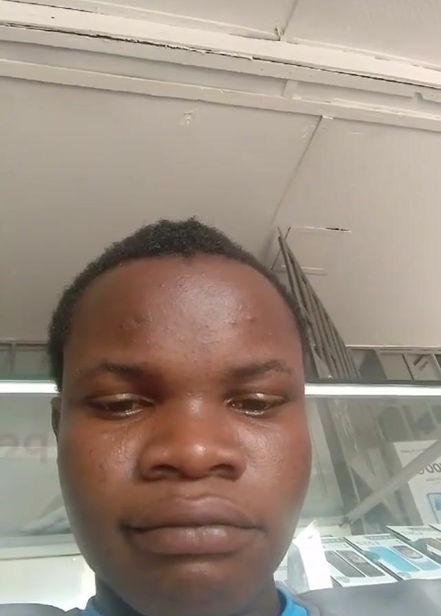 A close-up shot shows a Black man looking directly at the camera. He appears to be indoors, standing beneath a white ceiling with a patterned texture. Behind him, slightly blurred, is a glass display case filled with what appear to be mobile phones. The man is wearing a gray shirt with a blue neckline. His expression shifts from neutral to a slight furrowing of his brow.