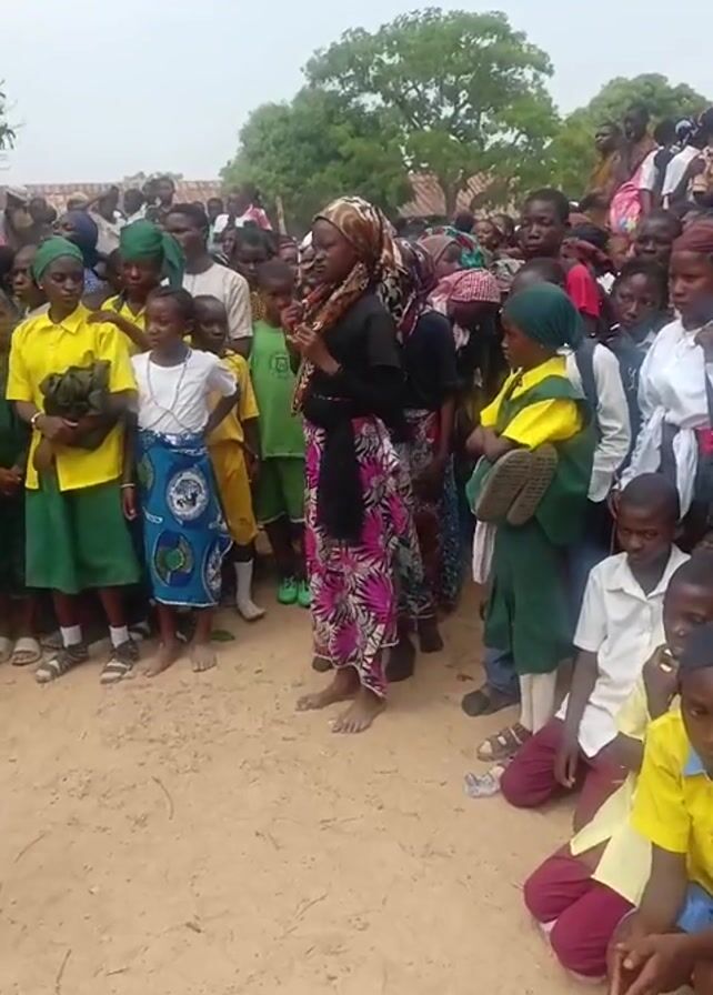 crowd of people, mostly children, standing in a sandy area outdoors. The children are wearing various outfits, including school uniforms in green and yellow, as well as casual clothing. A woman in the center of the frame, wearing a headscarf, black shirt, and a colorful floral skirt, appears to be addressing the crowd with a microphone. Some children are looking towards her. Trees and buildings can be seen in the background. The sky is overcast.