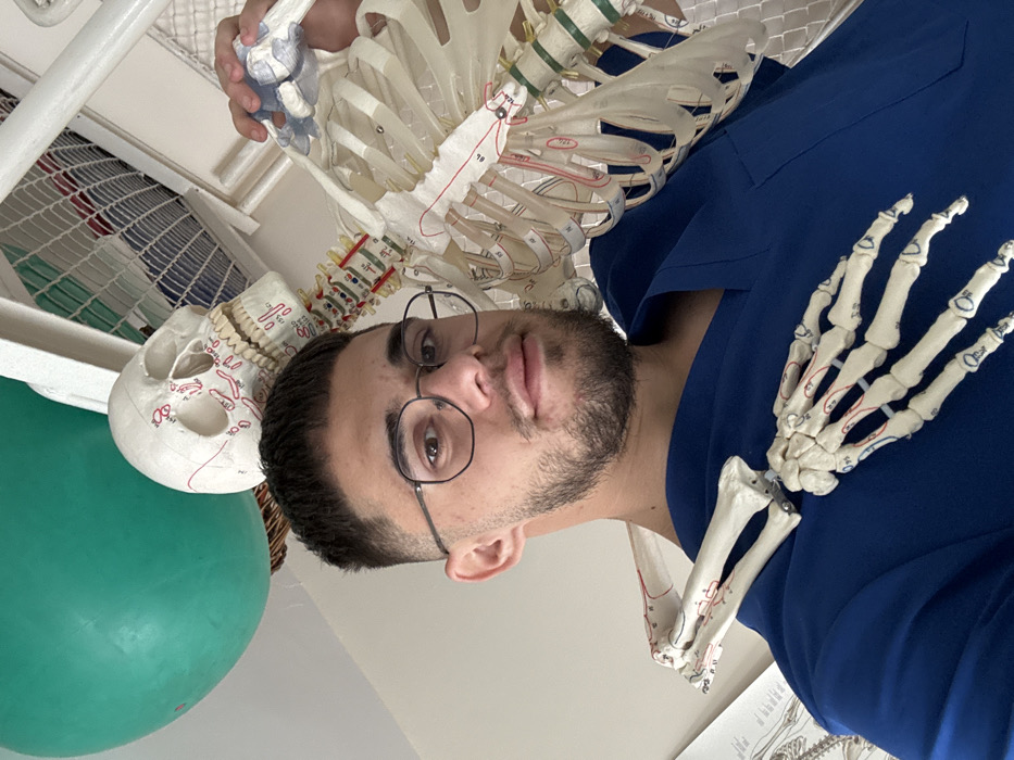 A male individual, appearing to be in his mid-20s, with short dark hair, a beard, and dark-rimmed glasses, is positioned in an indoor environment within Pleven, Bulgaria. He is wearing a dark blue medical scrub top and is captured in a selfie-style shot, looking directly at the camera with a neutral expression. An articulated human skeleton model is situated behind him and to his right. The skeleton's skull, marked with red lines indicating anatomical features and numerical labels, is visible above his right shoulder. Portions of the skeleton's spine, featuring segmented colored vertebrae, and a section of its rib cage, also marked with red lines, are visible behind the male. The skeleton's left arm, complete with its hand, is draped over the male's left shoulder, resting on his chest. The male's right hand is gripping the skeleton model at the left clavicle/shoulder joint. In the upper left background, a large, round, green balloon is partially visible. A white grid structure is present in the upper right background. A partial view of a poster or diagram, featuring anatomical illustrations, is visible on a wall to the left of the male's head. The setting suggests an anatomy lab, classroom, or similar educational/medical facility.