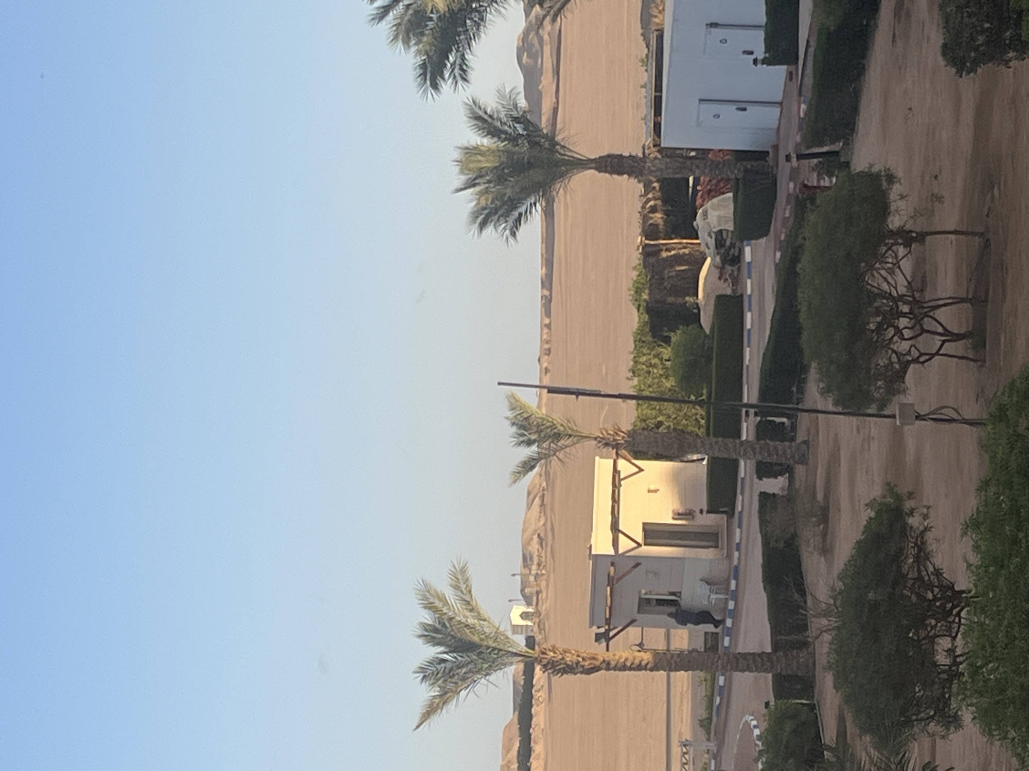 The image depicts an outdoor desert-adjacent scene in Unknown, Egypt, under a clear, pale blue sky during daylight. The foreground features a sparse, sandy ground with several green bushes and four prominent date palm trees of varying heights. A small, single-story beige security booth or building with a single window and door is centrally located, flanked by two palm trees. A male individual in dark clothing stands near the window of this booth, facing inwards. A white bench is positioned next to the booth. To the right, a white utility structure with two doors is partially visible behind a hedge. Paved pathways or roads with blue and white painted curbs snake through the area, bordered by trimmed green hedges. A dark vertical pole with attached wiring stands to the right of the central booth. The midground transitions into a vast expanse of flat, light brown desert sand. The background reveals undulating desert hills and mountains, with a distinct, light-colored building, possibly a small structure or monument, visible atop a distant hill.