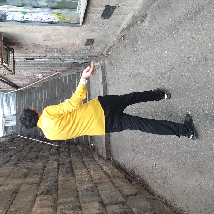 The image captures an outdoor urban passageway in Yerevan, Armenia. A single adult male, seen from behind, is walking away from the camera and slightly to the right, towards a set of stairs. He is wearing a bright yellow long-sleeved shirt with white striped cuffs, black trousers, and black athletic-style shoes with white reflective strips on the heels. His left arm is extended outwards, with his hand slightly open. In the background, a wide, multi-tiered concrete or stone staircase ascends between two walls, flanked by two light-colored handrails. The wall on the left side of the passageway is constructed from large, irregularly shaped, reddish-brown tuff stone blocks. The wall on the right side is a lighter, faded reddish-brown color, possibly stuccoed over stone. This right wall features a window with colorful decorative film or stained glass, displaying patterns in hues of purple, green, and yellow. Below the window, two dark, rectangular metal plates are affixed to the wall, and above it, a metal grate or shelf protrudes. The ground is a paved asphalt surface, exhibiting some wear and minor debris near the base of the right wall. The scene is illuminated by natural daylight, with no harsh shadows present.