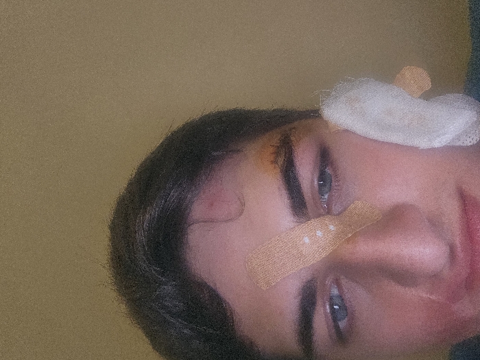 - "A close-up portrait depicts a young male with dark hair and blue eyes, exhibiting facial injuries and medical dressings" by FM-oPbvC2, licensed under CC BY 4.0
