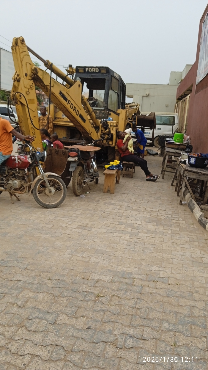 This image depicts an outdoor scene in Ijaiye, Nigeria, on 2026/1/30 at 12:11. The foreground is a paved area with interlocking concrete pavers. A large, yellow Ford 655 backhoe loader, bearing the "FORD" logo on its boom and cab, is stationary on the left side of the frame. Several individuals are present: a man in an orange shirt is partially visible on the far left, near a red motorcycle. Two other motorcycles are parked next to the backhoe; one features a brown sidecar. A woman in a red shirt and black pants sits on a wooden bench on the right, holding a baby wrapped in yellow fabric. Another wooden bench with yellow clothing draped over it is beside her. Two rudimentary wooden tables, laden with various items including a blue bucket, are positioned further right. Multiple men are visible around the backhoe, one in a camouflage-patterned shirt and another in a blue shirt. A young child in a red shirt is partially visible near the backhoe. In the background, a white van with "DURING" and "NG AREA" text is partially visible behind the backhoe, and structures including a reddish-brown building with a partially visible poster are present. The sky is overcast.