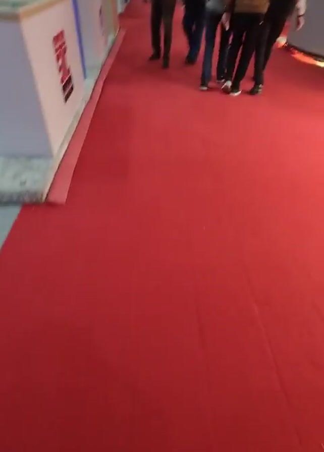 first-person perspective of someone walking along a red carpet in a large indoor space, likely a convention center or trade show