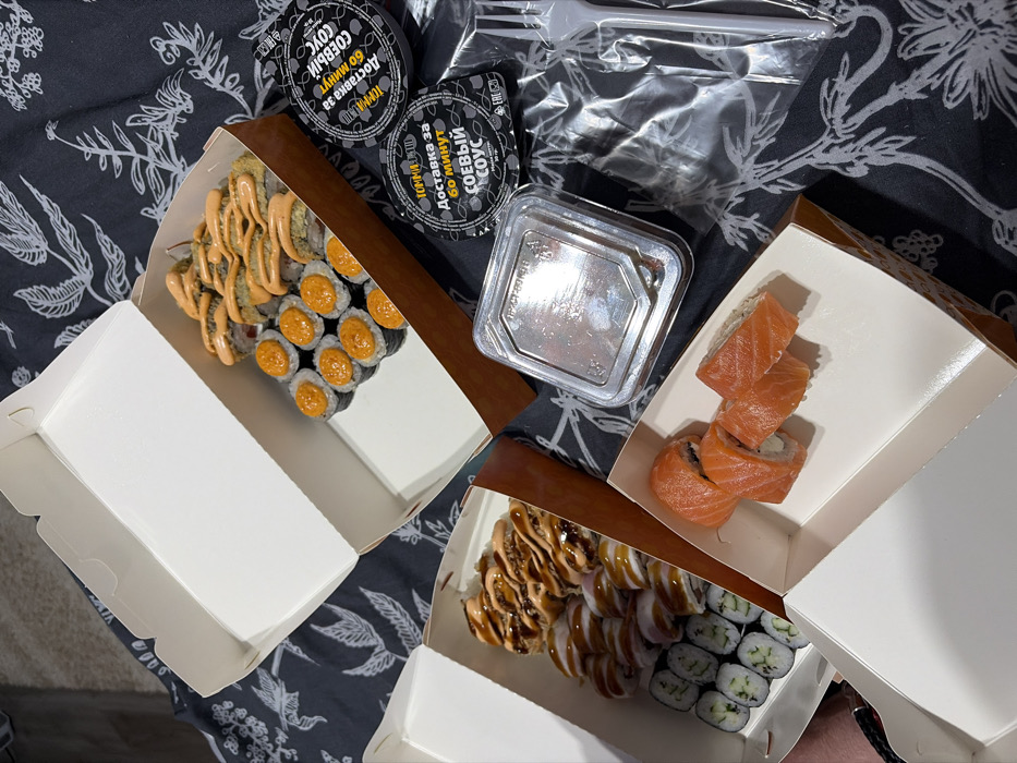 - "An overhead shot showcases an assortment of sushi delivery containers on a patterned surface" by FM-rbhEP2, licensed under CC BY 4.0