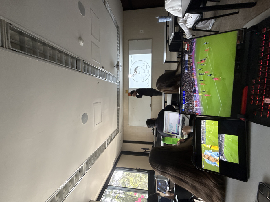 The image depicts an indoor classroom or lecture hall in Interlomas, Mexico. The perspective is from a student's desk, facing the front of the room. In the immediate foreground, a black laptop with a red backlit keyboard displays a live soccer match from ESPN+, showing "ATL 1 - BAR 1" at the "37:59" mark, with "WORLD'S BEST AIRLINE QATAR AIRWAYS" visible. To its left, a black tablet displays a split screen, with the upper portion showing a male soccer player in a yellow jersey, and the lower portion showing a different view of a soccer match. A smartphone is partially visible on the far left edge of the desk. Three students are visible from behind in the midground. The student closest on the left has long, dark brown hair and is positioned near a light green water bottle and a silver laptop. A male student further back uses a silver laptop. To the right, another student is partially visible, wearing a white long-sleeved top. At the front of the classroom, a male instructor or presenter, dressed in a dark suit jacket and white shirt, stands facing the seated students. His right hand is raised near his face. Behind him, a large white whiteboard displays an image projected from a ceiling-mounted projector. The projected image features a circular diagram containing a stylized drawing of a dog, surrounded by text including "significado," "perro," "dog," "hound," and "canine." The room is illuminated by overhead fluorescent light fixtures recessed in the white ceiling, which also features several circular white speakers and square access panels. Large windows along the left wall show green trees outside, indicating natural light entering the room. Dark-colored tables and chairs are arranged in rows. A blue cup with a straw rests on a table to the far right.