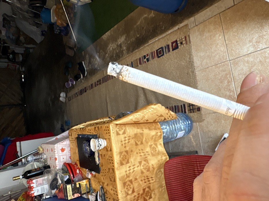 The scene depicts an interior space, likely a utility area or garage, located in the city of Stefan Karadja, Bulgaria. A human hand, positioned in the lower-left quadrant of the frame, holds a lit cigarette. The cigarette exhibits a white paper wrap, a light brown filter with "Rilka" faintly visible, and a prominent column of ash at its tip, from which a wisp of smoke ascends. To the left, a rectangular table is covered with a golden-yellow tablecloth featuring a repeating geometric diamond pattern. Beneath the table, two large, clear plastic water bottles are visible. The table surface is populated with various items: a dark-colored ashtray containing ash and cigarette butts, a white ceramic cup with a blue design, a red container, a "SYOSS" brand hair dye box, a dark glass bottle (possibly wine), several white cartons, a clear plastic water bottle, and miscellaneous small objects. A segment of a red upholstered chair is visible at the extreme lower-left. The floor consists of light-colored square tiles. A patterned rug, displaying brown, red, black, and blue geometric motifs, lies on the tiled floor. Several pairs of shoes are arranged on the rug towards the rear: one white pair, one purple pair, and one black pair. The background is dimly lit and appears cluttered with various items, including buckets and containers. A dark structure, possibly a closed garage door or large double door, is visible in the far background. A segment of a green mat is present on the far right.