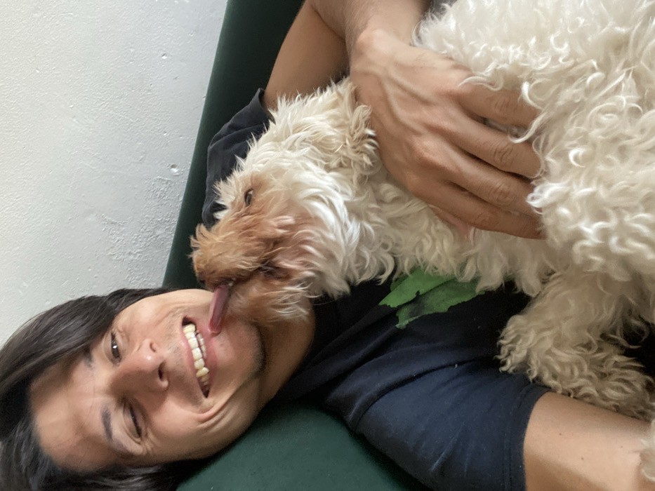 The image depicts an indoor scene in Wilde, Argentina. A male individual with dark hair is positioned on a green upholstered surface, possibly a couch. He is seen smiling broadly, exposing his upper teeth, with his head tilted slightly to his right. He is wearing a dark-colored t-shirt. A small, light-colored dog, predominantly white with tan markings and curly fur, is situated close to the man's face. The dog is actively licking the man's lower lip or chin area, with its tongue visibly extended. The man's right hand is visible, resting gently on the dog's fur, suggesting physical contact. The background consists of a plain, light-colored wall exhibiting minor surface irregularities. The interaction between the man and the dog appears affectionate.