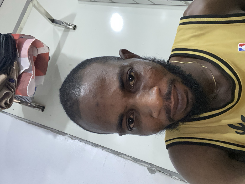 A man with a close-cut dark hairline and a full black beard gazes into the camera. He is wearing a yellow jersey with black stripes along the edges. A thin gold necklace is visible around his neck. To his left, there is a metal rack holding folded fabric. The background is a plain white surface. The image appears to be taken at an angle, with the subject positioned slightly off-center.