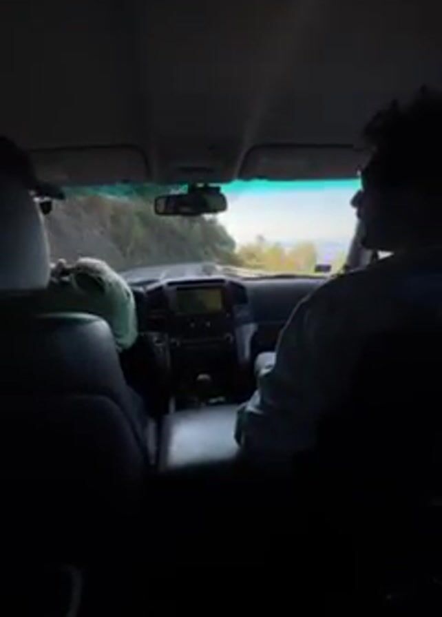 Two people are in a car driving along a winding mountain road. The driver is wearing a green shirt and a baseball cap. The passenger has curly hair and is wearing a light blue shirt. The interior of the car is dark. The sky is visible through the windshield.
