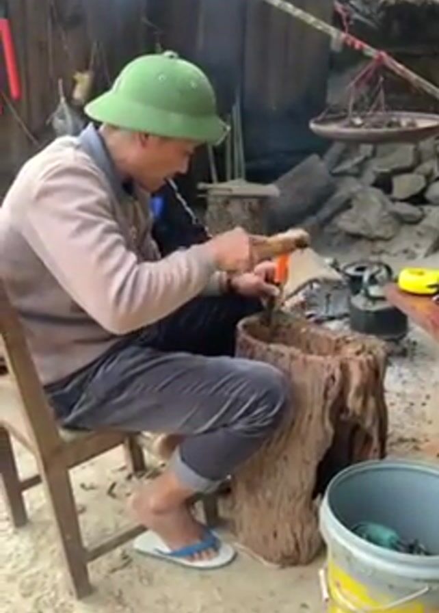A man is working outdoors. He is seated on a wooden chair, wearing a light brown long-sleeve shirt, gray pants, and blue and white flip-flops. He also wears a light green hat. He is using a hammer to strike a chisel, which is positioned against a hollowed-out tree stump. A bucket is next to the tree stump. Behind him is a fire pit, with a pot sitting on it. There are various other objects and tools scattered around the area. He takes the wood he has worked on and examines it. Another man is partially visible in the background.