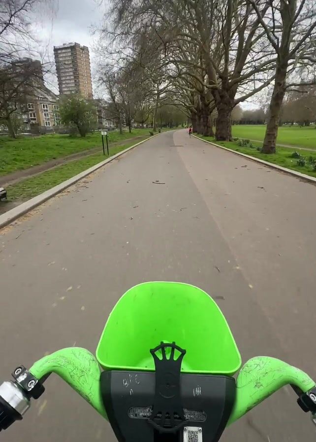first-person perspective from someone riding a bright green electric scooter on a paved path through a park