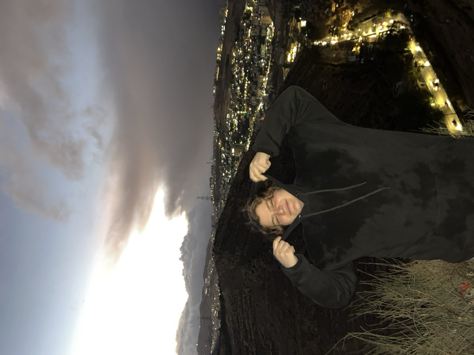 A young male subject with light brown, wavy hair is positioned centrally in the foreground, facing the camera with a slight smile. He is wearing a dark, possibly black, hooded sweatshirt with visible drawstrings, and his hands are raised to grasp and slightly pull up the hood around his head. The sweatshirt exhibits areas that appear damp or reflective. Sparse, dry vegetation is visible in the lower-left foreground. The scene is set on an elevated terrain overlooking an urban area identified as Dummar Municipality, Syria, under twilight or nighttime conditions. The city spans across multiple hills and valleys, illuminated by a dense network of artificial lights from buildings and streets. A winding road with active vehicle lights is visible in the lower-right background. Utility towers and power lines are present on distant hills. The sky above is partially covered by clouds, with a brighter, lighter-colored cloud formation on the left transitioning to darker, denser cloud cover on the right.