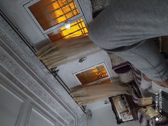 A room features ornate white walls and decorative moldings. Sheer beige curtains hang beneath windows that have orange tinted panes. One window is visible near the top and a matching one is closer to the floor. A section of patterned purple and gold cushions are visible under light grey pants. A small table is adorned with a picture frame.