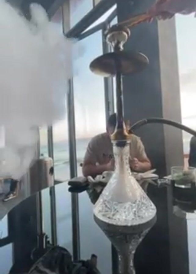 person using tongs to adjust coals on top of a hookah in a well-lit restaurant. The hookah is on a black table, with a clear glass base filled with smoke. In the background, people are seated at other tables near large windows overlooking the ocean. Another person is sitting at the table, visible in the background. A patio heater stands near the window. Smoke is rising from the hookah.