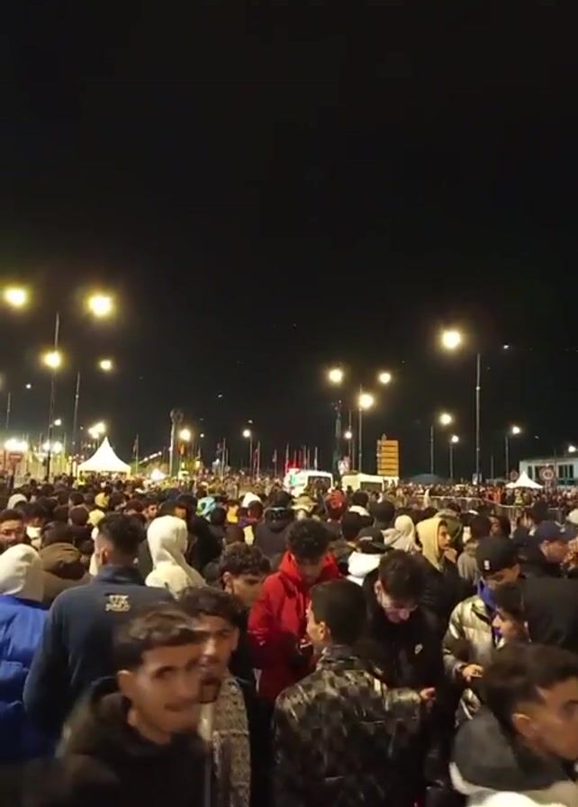 dense crowd of people at night, likely outdoors. Most people appear to be young men, dressed in casual attire like jackets, hoodies, and hats. Streetlights illuminate the scene. In the distance, there is a white tent and several flags. The crowd seems tightly packed and moves slowly. There is also at least one ambulance present. The overall atmosphere appears busy and lively.
