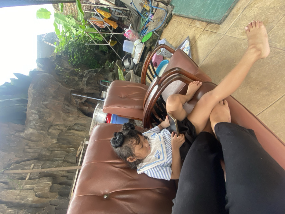 A young child with dark hair in buns, wearing a blue and white striped shirt and dark shorts, reclines on a brown leather couch while holding a phone. One leg is extended upwards, foot visible against a tiled floor. A second brown leather couch is partially visible. A person wearing black pants sits on the same couch. Background includes a rock wall, green foliage, and various outdoor items like a clothes drying rack and plastic containers.
