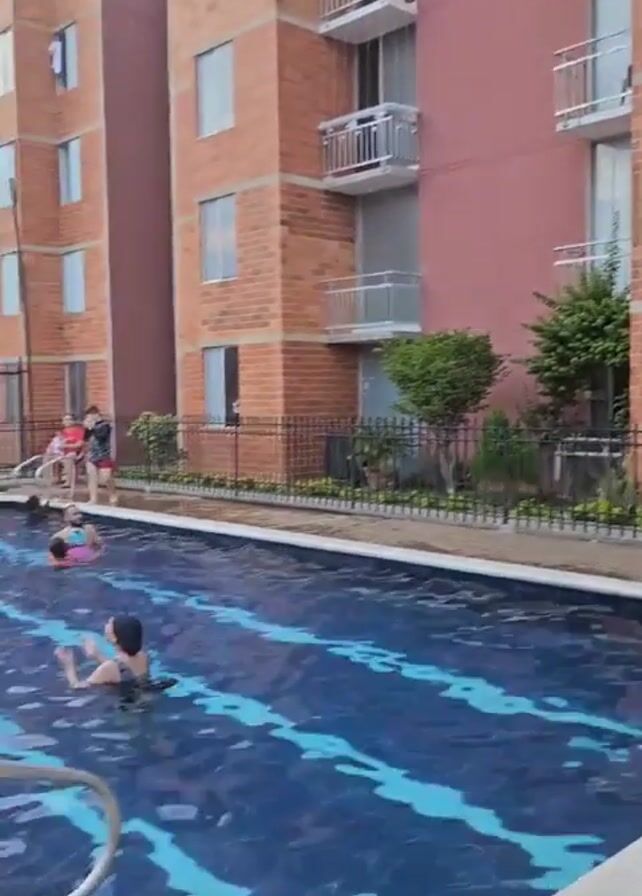 rectangular swimming pool surrounded by a paved area in an outdoor setting. Several people, including adults and children, are in the pool. Some are swimming, others are standing or sitting in the water. One person is seen tossing a ball. A black fence runs along the perimeter of the pool area, separating it from the surrounding landscape. In the background, there are multiple apartment buildings with brick facades and balconies. A playground structure is visible near the pool. The video pans across the scene, capturing different angles of the pool and the people enjoying the water.