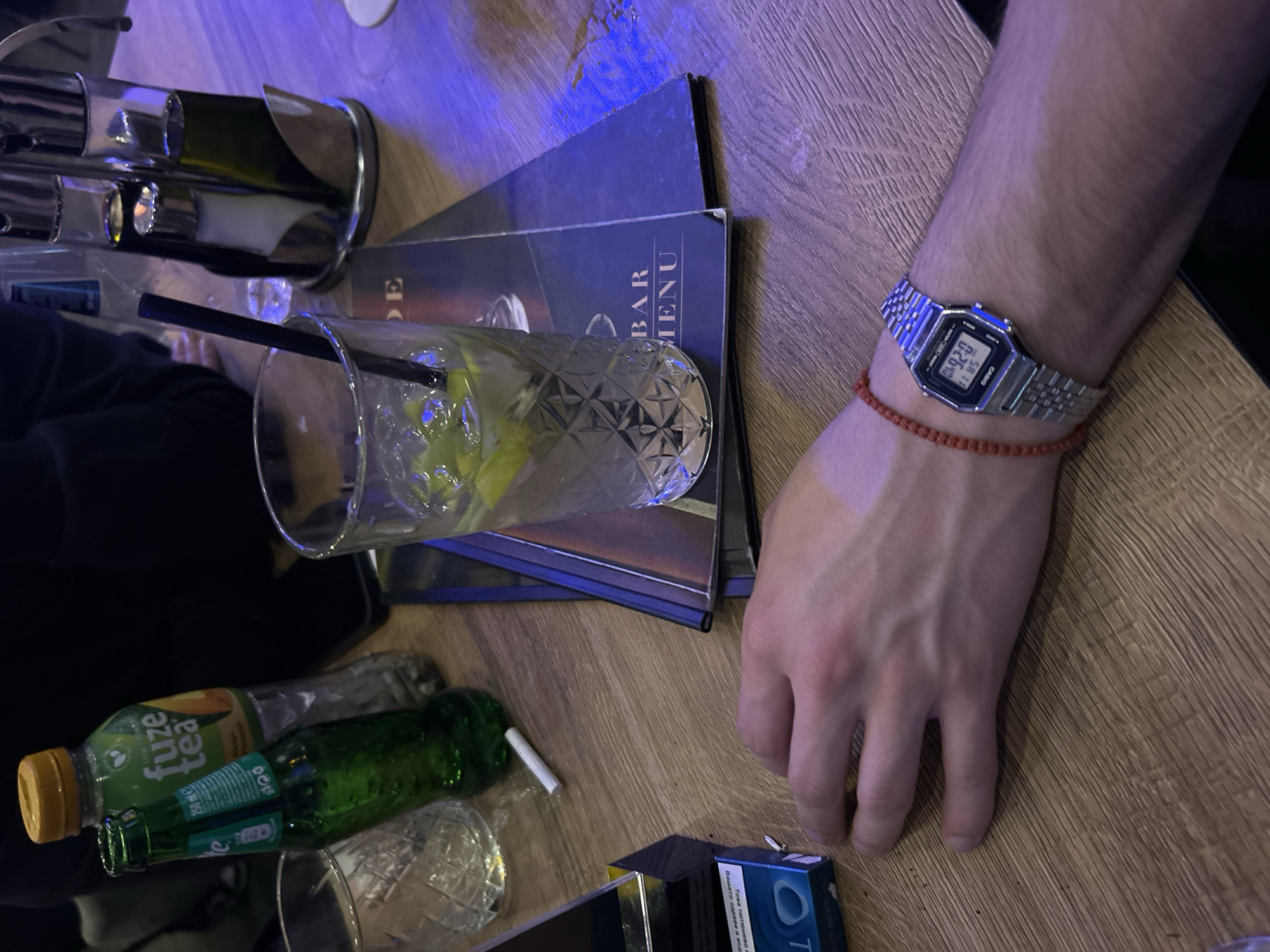 The image captures a scene on a wooden table, possibly in a bar or cafe in Goce Delcev, Bulgaria. The dominant elements include a clear patterned glass filled with a beverage, likely containing ice and citrus slices, with a black straw. Adjacent to the glass is a layered bar menu with "BAR MENU" visible on the edge. To the left, there's a metal utensil holder with multiple slots for cutlery or straws. Partially visible are a "Fuze Tea" bottle and a green glass bottle, suggesting consumed beverages. A rolled cigarette butt is also present. A person's arm and hand are prominently featured on the right side of the frame. They are wearing a silver Casio digital watch and a simple red cord bracelet. The hand appears to be resting on the table, near a pack of cigarettes and a smartphone. The scene has a somewhat cluttered and casual feel, typical of a bar or cafe environment.
