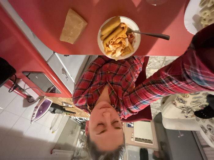 A person wearing a red plaid shirt holds a camera at a high angle, looking down at a red countertop. On the counter is a plate of pasta with tomato sauce, a piece of cheese, and a glass. An iron sits on the counter near a white kitchen appliance. In the background is a living room with a white sofa.