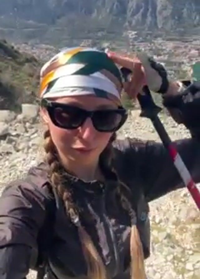 A person with long braids is standing on a rocky hillside, holding hiking poles and looking towards the camera. The person is wearing sunglasses and a patterned headscarf, with a dark jacket. Behind the person, there is a vista of mountains, a town, and a body of water. The person moves the hiking poles and looks around, showing different angles of the view. The sky is clear and blue.