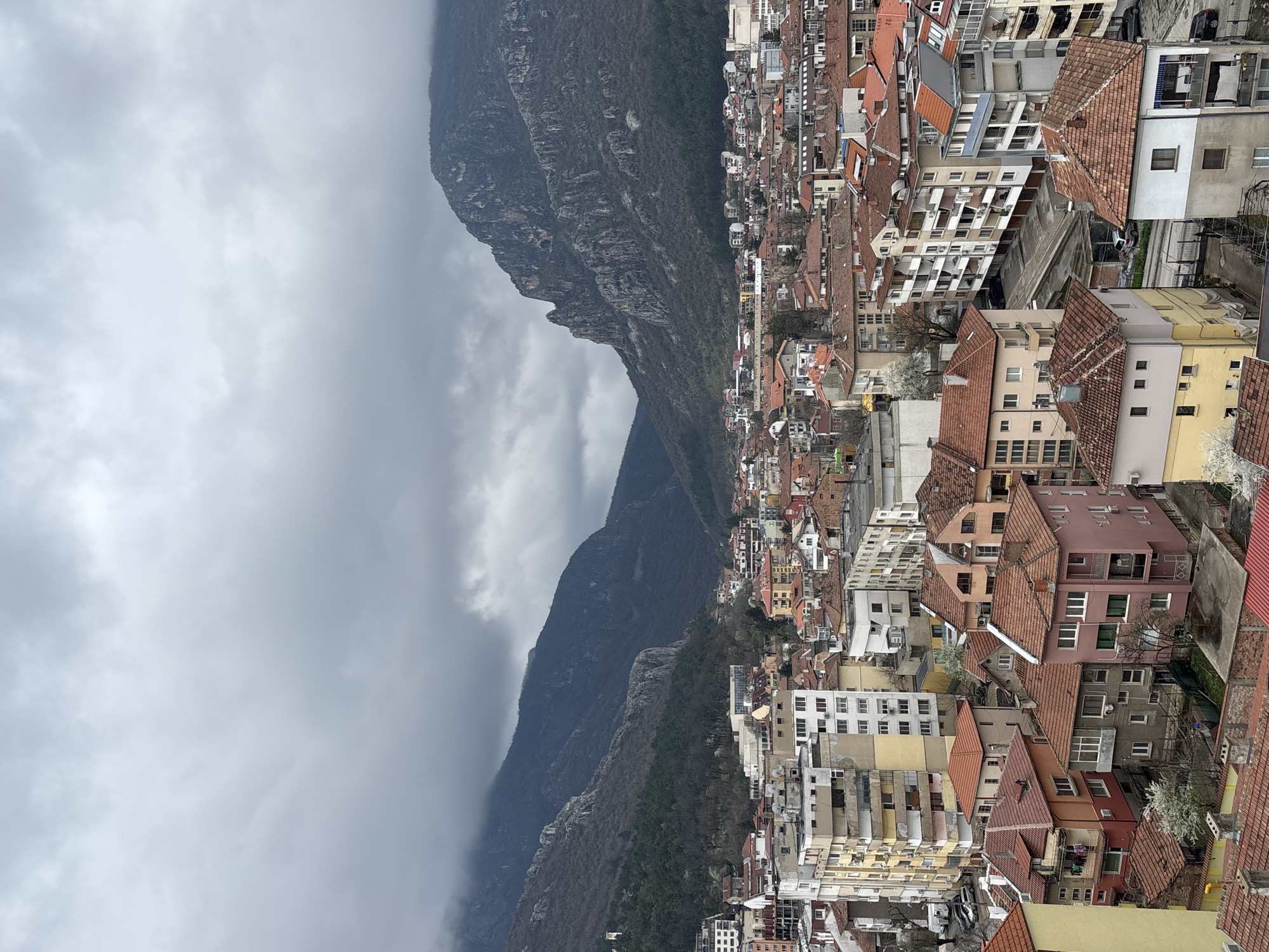 view of the city of Vratsa, Bulgaria, with the Vratsa Balkan mountain range dominating the left side of the frame