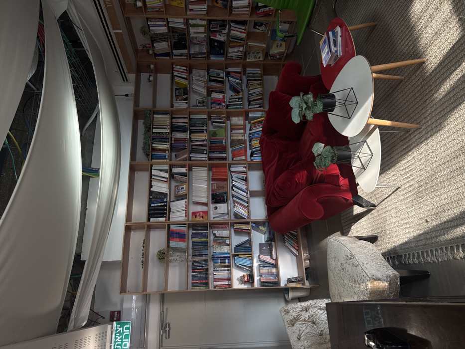 This image depicts an interior view of a reading lounge or library area located in Tel Aviv, Israel, identifiable by the Hebrew "יציאת חירום" (Emergency Exit) sign on the left wall