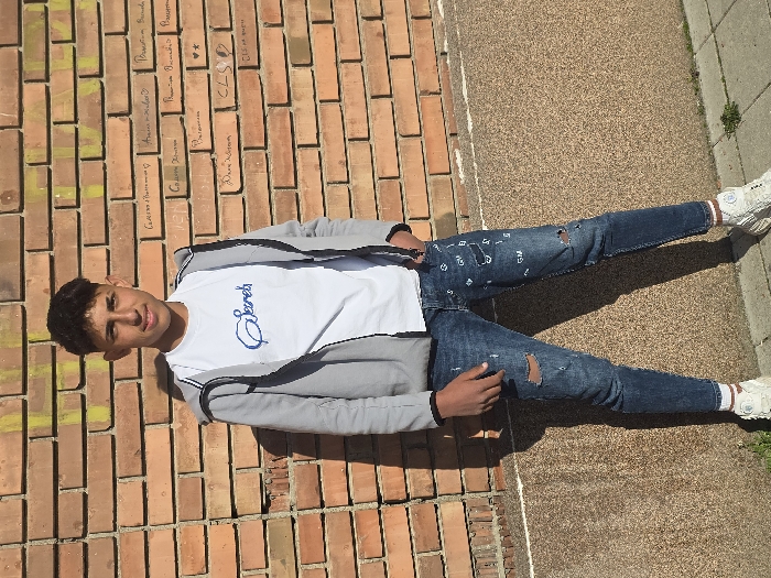A young male, possibly of Middle Eastern or Mediterranean ethnicity, stands centrally, facing slightly right with his head turned towards the camera, exhibiting a slight smile