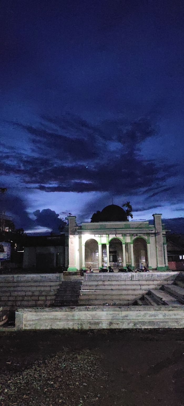 The image depicts a nighttime scene featuring a mosque in Cut, Indonesia