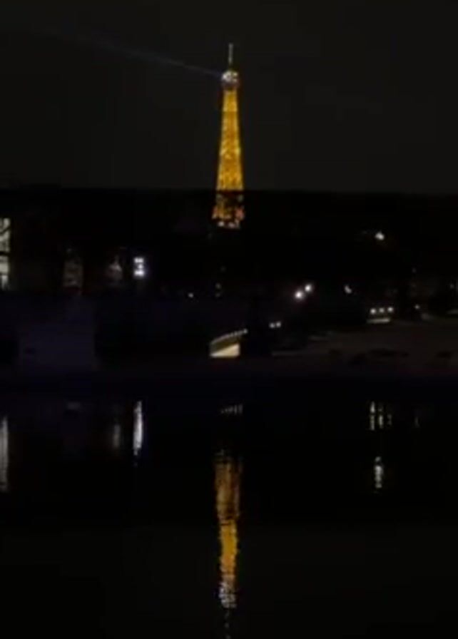 Eiffel Tower at night, with a bright light beam shining from its peak. The tower is illuminated with a golden glow and is reflected in the dark water below. The scene is otherwise dark, with minimal ambient light. There is a suggestion of a bridge and some buildings in the background. Voices are audible in the background, but no other people are visible.