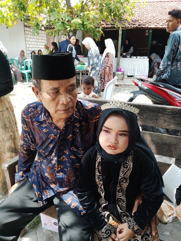 This image depicts an outdoor gathering in Juwana, Indonesia, under a tree canopy with direct sunlight. In the foreground, an older man with a dark complexion, wearing a black songkok and a blue and brown patterned batik shirt over black trousers, is seated on a wooden bench. His gaze is directed forward and slightly downward. His right arm is behind a young child seated next to him, and his right hand rests on the child's left knee. The child, appearing to be a young girl, wears a black hijab, a gold-colored tiara, and a black velvet-like dress with prominent gold embroidered scrollwork. Her face is made up with pink eyeshadow and lipstick, displaying a solemn expression. A white "Clever" brand box is partially visible under the man's left leg. In the midground, a young boy with dark skin looks over the man's left shoulder. The background features multiple individuals gathered around. To the left, several women in hijabs are seated on green plastic chairs. Further right, a white-draped table with white bowls suggests food service, with women in various traditional garments standing and interacting. A man in a dark floral shirt stands next to a red and black scooter on the far right. The environment includes a dirt ground, a white wall, and a traditional building with a brown tiled roof.
