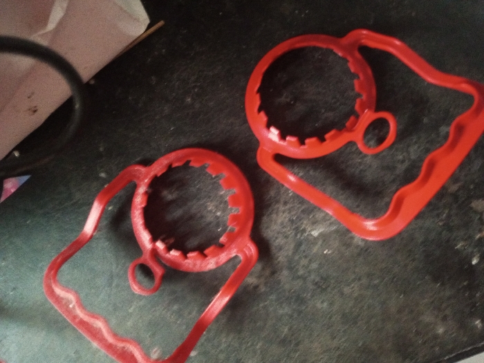 Two red plastic bottle carriers sit on a dark surface. Each carrier features a circular, serrated opening designed to grip a bottle cap, a small loop beside the circular opening, and a curved handle shaped for hand comfort. The surface is uneven and possibly metallic with specks of dust or debris. An out-of-focus object and a possible piece of white tissue appear in the background.