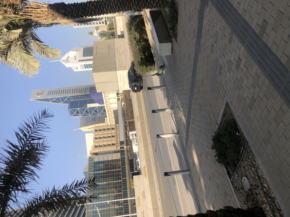 A high-angle view captures a cityscape framed by palm trees. Modern skyscrapers with geometric designs rise against a clear blue sky. A street runs alongside a brick-paved walkway, punctuated by bollards. Parked cars and a lone scooter are visible on the street. A rectangular flower bed with gravel and greenery sits on the walkway. The overall composition is urban and contemporary.