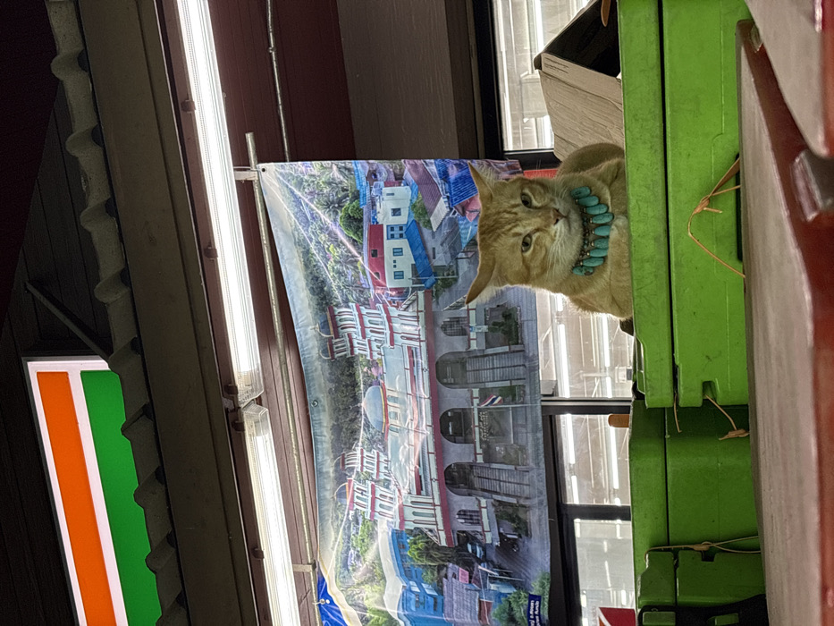 This image, taken in Ban Ko Li Pe, Thailand, displays an interior scene within a commercial establishment. A light orange tabby cat, wearing a necklace of multiple turquoise-colored oval beads, is seated upright in the midground. The cat rests on two stacked, rectangular, bright green plastic crates, facing forward with its front paws tucked. Directly behind the cat, a large banner is displayed, depicting a multi-domed and multi-towered building, consistent with a mosque, situated amidst green hills and colorful residential structures. A Thai flag is visible on a pole within the banner's depicted scene. Above the banner, two fluorescent light fixtures are mounted. In the upper left corner, a partial sign showing horizontal orange and green stripes is visible, indicative of a 7-Eleven store, positioned beneath a dark, corrugated ceiling.