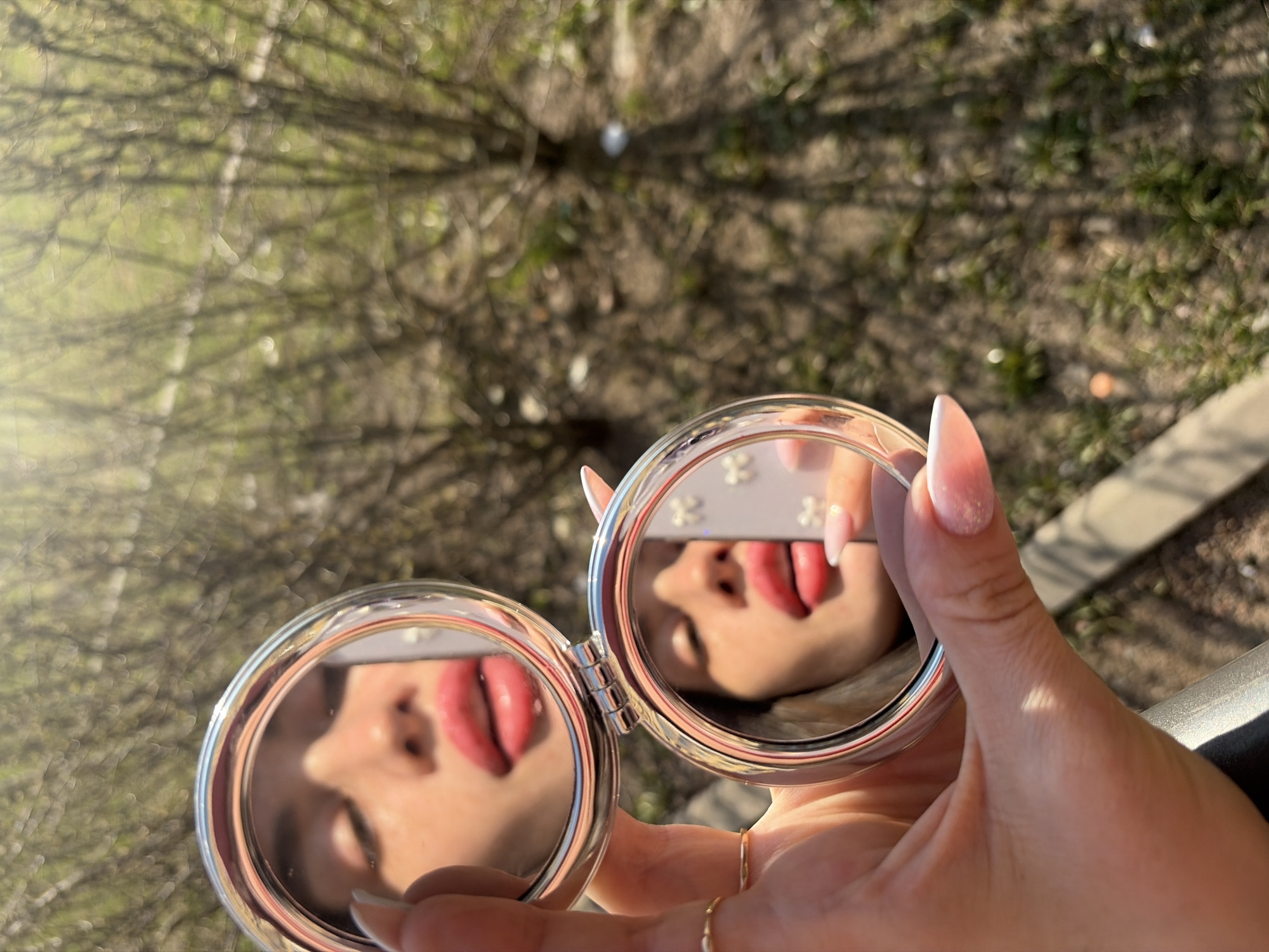 A close-up shot captures a woman's hand holding an open compact mirror in an outdoor setting