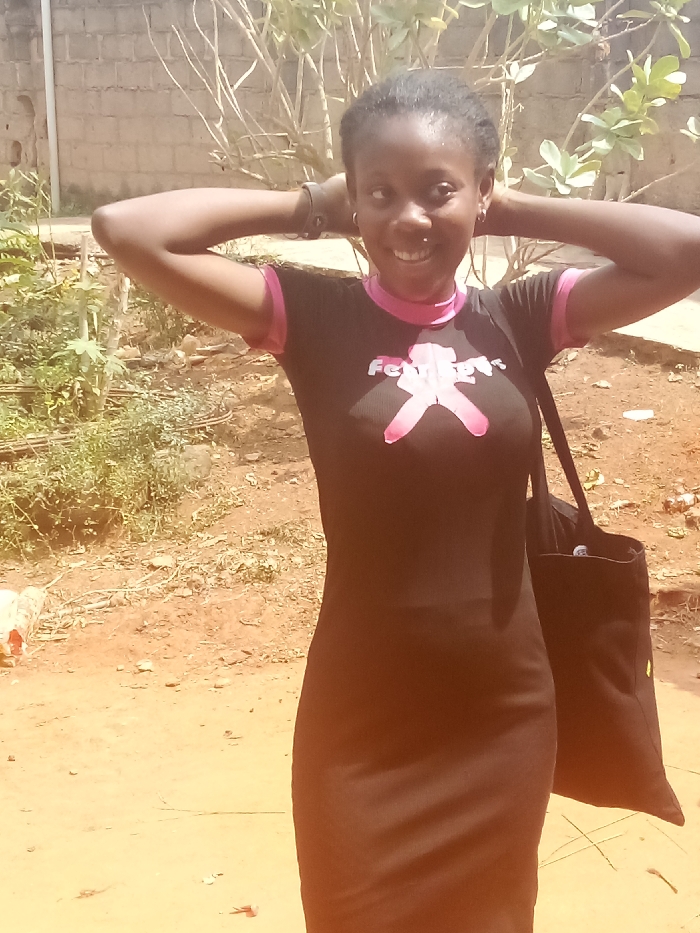 A young adult female, appearing of Black ethnicity, is captured in a full-length, slightly off-center portrait within an outdoor environment consistent with areas in Lagos, Nigeria
