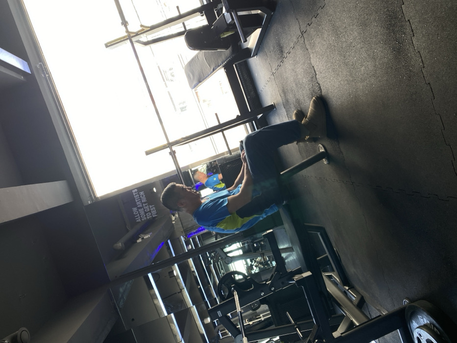 In a gym setting, a man with gray hair is seated on an inclined workout bench, his feet resting on a support bar. He is dressed in dark pants, tan shoes, and a blue and green shirt. Surrounding him are various gym equipment, including weight machines and a bench press. A sign on the wall reads "ALLOW SOME ARTISTS TO GET RICH FIRST." The image is taken from a low angle, capturing the gym's high ceiling and a window allowing natural light into the space.