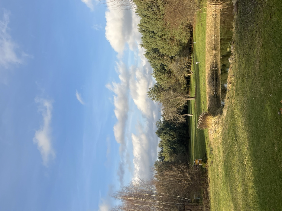 The image presents an outdoor rural scene located in Petriškė, Lithuania, under a clear blue sky interspersed with scattered cumulus clouds. The foreground is primarily a well-maintained green grassy field, exhibiting areas of direct sunlight and shadow. In the left-central portion of the foreground, a multi-tiered beehive, colored yellow and brown, is situated on a low earthen mound. To the right, a placid body of water, consistent with a pond, occupies the lower right quadrant, reflecting the sky and nearby foliage. Its banks are lined with dry reeds and natural debris. The midground features several defoliated deciduous trees; a cluster of slender, light-barked trees is visible on the far left, while several mature, gnarled trees, possibly fruit-bearing, are spaced across the grassy expanse towards the center. Two small white markers or objects are discernible on the ground in the distant midground. The background is dominated by a dense coniferous forest, composed of dark green evergreen trees, stretching across the entire horizon. No individuals, animals, or active interactions are depicted within the scene.