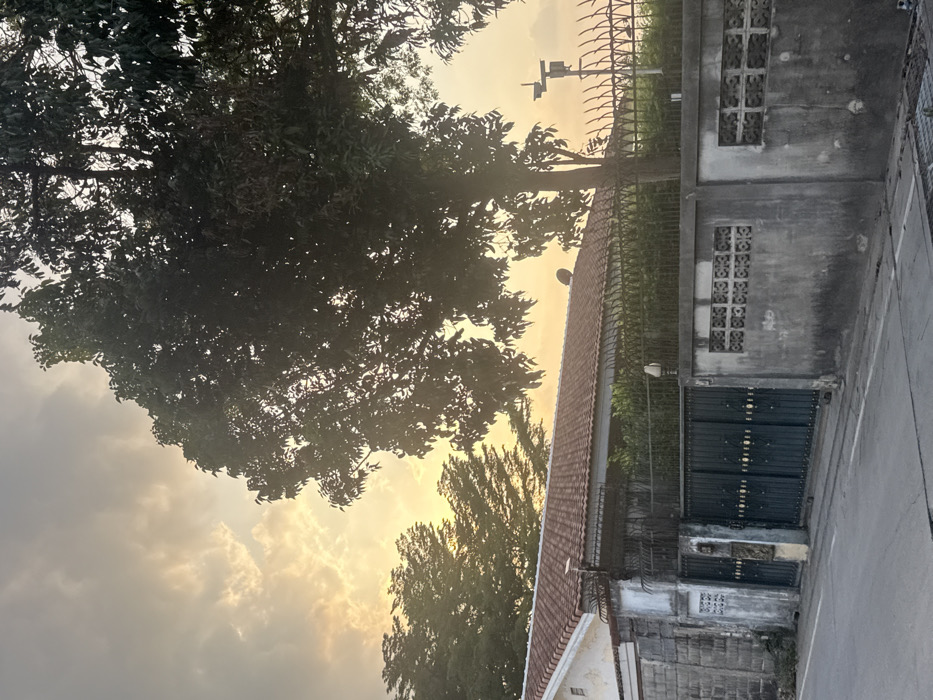The image displays an exterior street scene in Muang Pattaya, Thailand, at either sunrise or sunset, indicated by the warm, golden-orange light illuminating the partly cloudy sky. The foreground features a dark asphalt road. In the midground, a weathered concrete perimeter wall runs parallel to the road, featuring sections of patterned ventilation blocks and visible discoloration. Integrated into this wall is a large, dark green, double-leaf metal gate with decorative elements. To the left of the gate, the concrete wall exhibits exposed block construction. Above the concrete wall and gate, a dark metal security fence with sharp, upward-pointing spikes extends across the property line. Behind this fence, a single-story residence with a reddish-brown tiled roof is visible, along with light-colored exterior walls. A satellite dish is affixed to the roof. Dense green foliage and a large tree, silhouetted against the bright sky, occupy the area behind the fence and house, with the largest tree dominating the upper right portion of the frame. On the right, behind the spiked fence, a utility pole or mast supports what appears to be a surveillance camera or communications equipment. No individuals or active interactions are present in the scene.