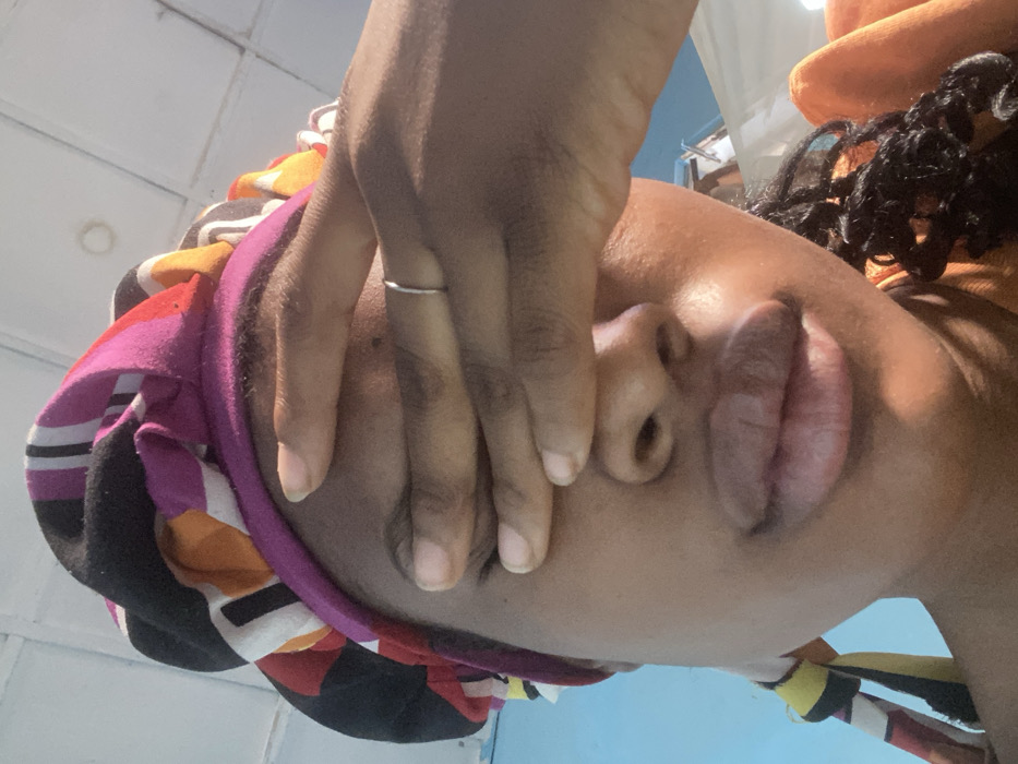 A close-up shot shows a person's face with dark skin. The person has full lips, a small nose, and is wearing a colorful head covering with patterns. A hand with a silver ring is partially obscuring the person's face, with fingers touching the forehead. The background appears to be a brightly lit room.